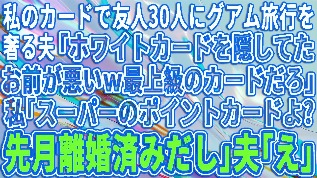 【スカッと】私のクレジットカードで友人30名にグアム旅行を奢る夫「嫁の金は俺の金wホワイトカードってブラックカードの更に上って事w」私「100均のポイントカードですよ?先月離婚してますし」【修羅場】