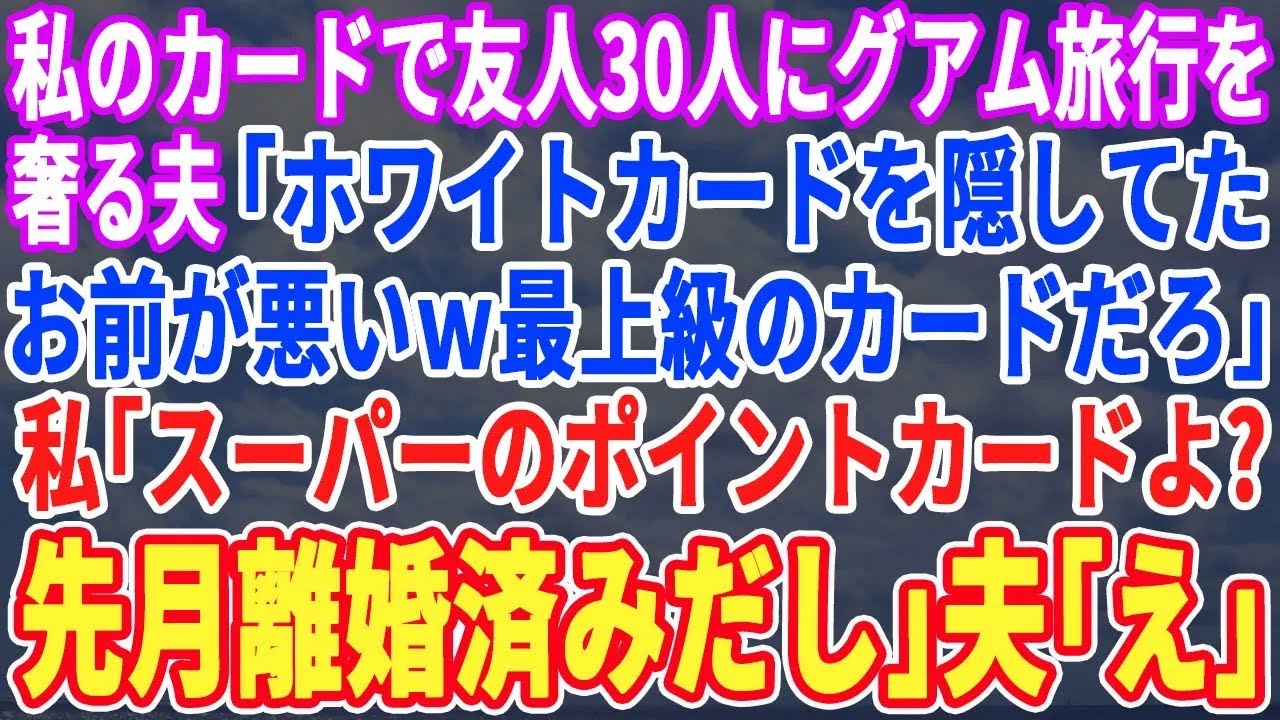 ①【スカッとする話】私のクレジットカードで友人30名にグアム旅行を奢る夫「嫁の金は俺の金wホワイトカードってブラックカードの更に上って事w」私「100均のポイントカードですよ?先月離婚してますし」