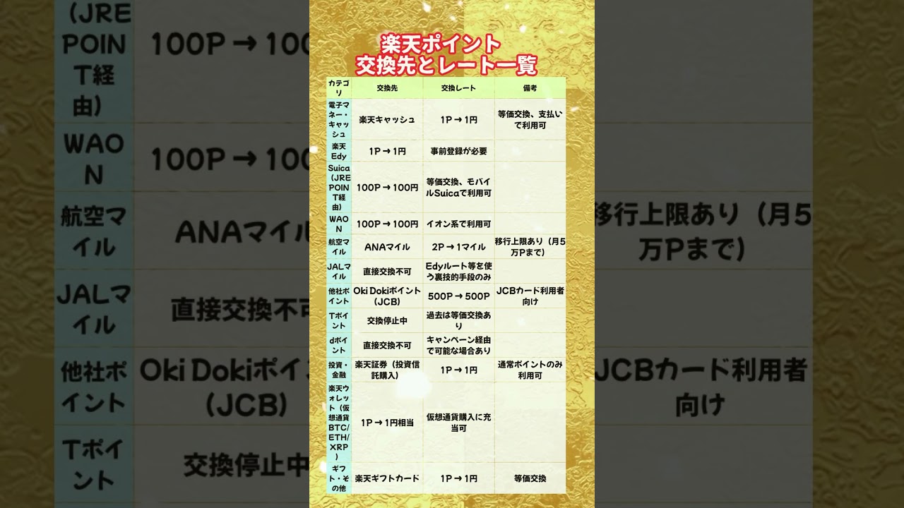 楽天ポイントは「1ポイント=1円」として使えるだけでなく、ANAマイルや電子マネー、投資信託や仮想通貨など多彩な交換先があります。本記事では、楽天ポイントの主な交換先とレートを一覧表でまとめ、どこに使うとお得なのかをわかりやすく解説します。