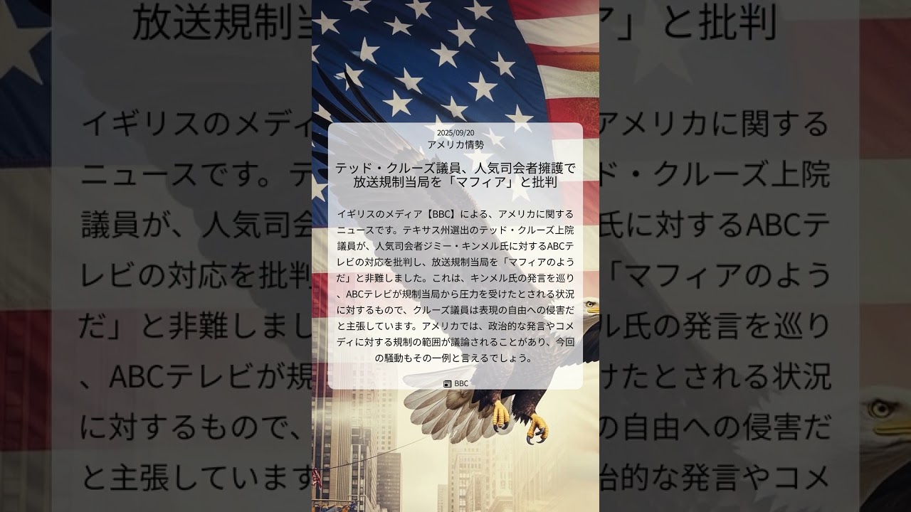 #BBCニュース #テッドクルーズ #ジミキンメル #ABCテレビ #放送規制 #表現の自由 #アメリカ情勢 #20250920 #Shorts